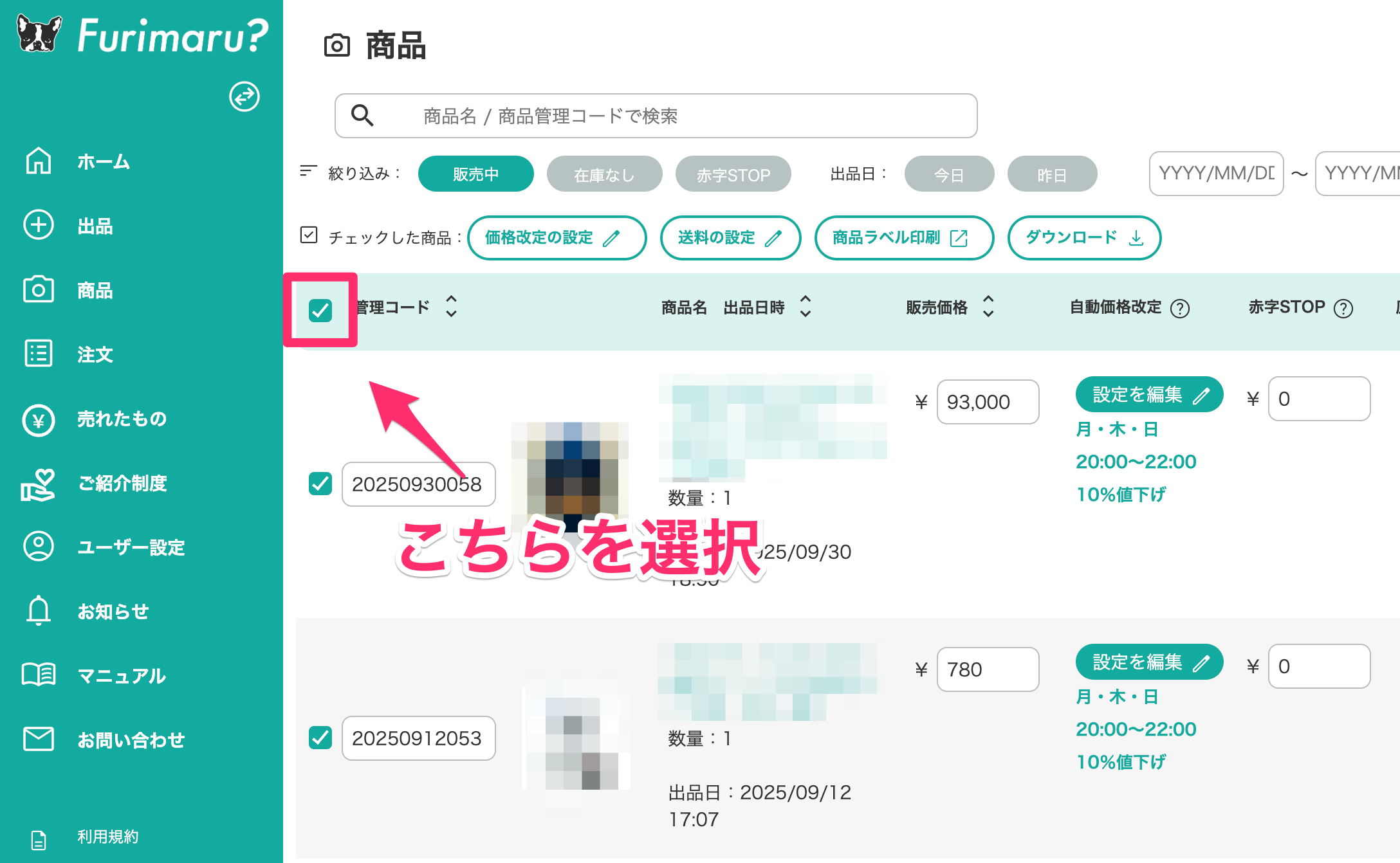 まず、Furimaruの「商品」画面にアクセスします。ここでは、現在販売中の商品が一覧で表示されます。