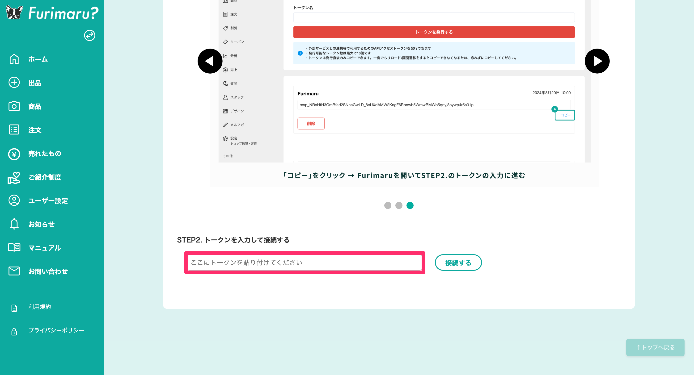 メルカリShopsでコピーしたトークンを貼り付けて、「接続する」を押したら接続完了です。