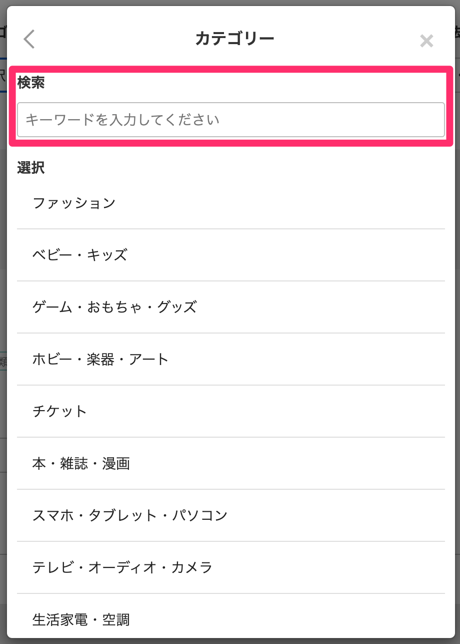 また、カテゴリーを選択する際にはキーワード検索がおこなえるのも、フリマルの出品機能の特徴です。